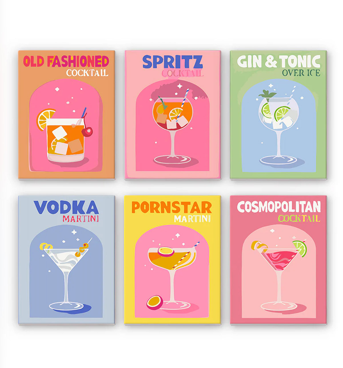 Für schnelle Sessions eignen sich die Mini Paint-by-Numbers perfekt – wie die „Moderne Bar-Mixologie-Kunst Serie 4“ (6 Stück à 15×20 cm).