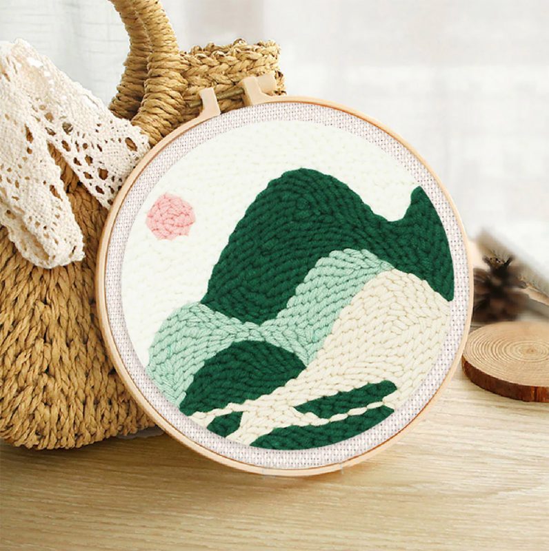 Wer es weich und taktil mag, wird an dem Punch-Needle-Set „Grüne Berge“ Freude haben. Daraus entstehen flauschige Wanddekos, die ich mir gut im Kinderzimmer oder als Kissenbezug vorstellen kann. Die Technik ist leicht zu lernen, gearbeitet wird mit Wolle in warmen Erdtönen.